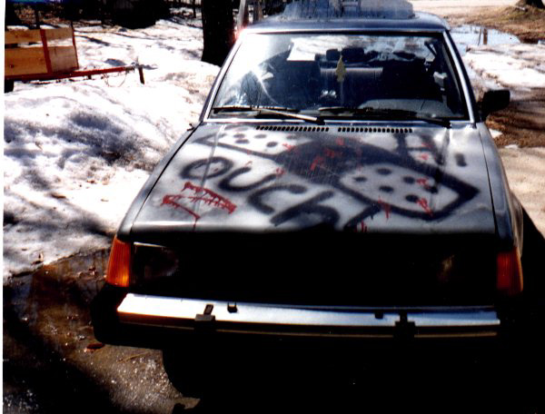 Yes, I actually did drive this car. This picture was taken after it was hit by a semi. My friend and I fixed it by ourselves with the help of a sawzall and a sledgehammer. We got done and figured since half of my car was blue and the other half was grey we might as well spruce it up a bit with a can of spray paint. Well you can figure out the rest. I got some weird looks driving around town with it but i'm just crazy like that so i didn't care. | ||||||||||||||||